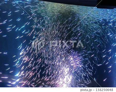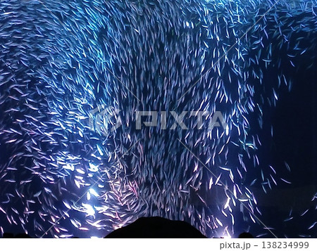 日本の水族館で泳ぐイワシの群れ|紫の光が幻想的な海中展示