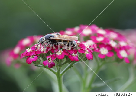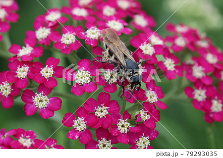 初夏の公園に咲くノコギリソウの蜜を吸うハラナガツチバチ