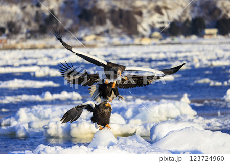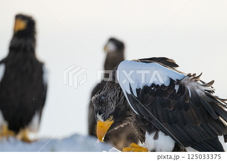 青空や雪上を飛翔するオオワシやオジロワシなどの猛禽類
