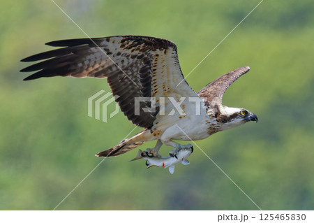 蒼天の中ボラと一緒に飛ぶミサゴ