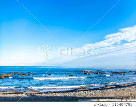 掛川市にある青空に映える潮騒橋から見た海と国安海岸の風景(静岡県)