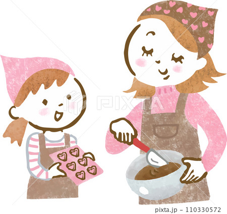 バレンタインのチョコレートを手作りする親子の手描きイラスト
