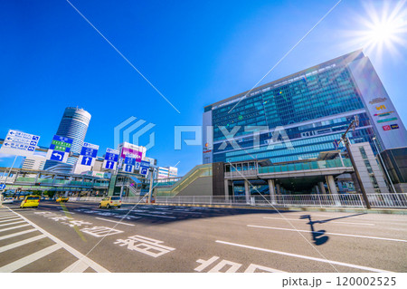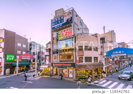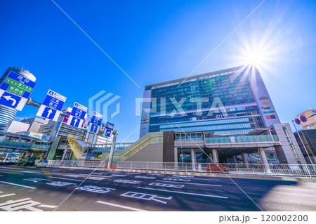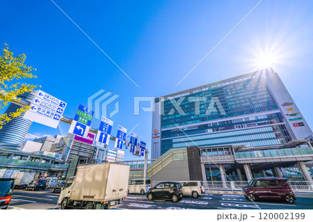 日本の横浜都市景観 9月。東急電鉄 日吉駅前。浜銀通りなどを望む