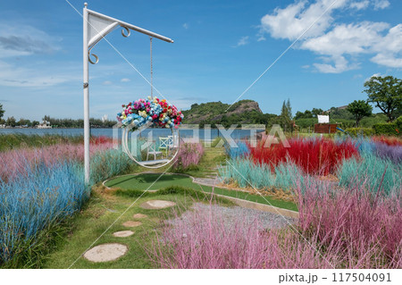 colorful grass decor in cafe garden with chairs and swing by lake