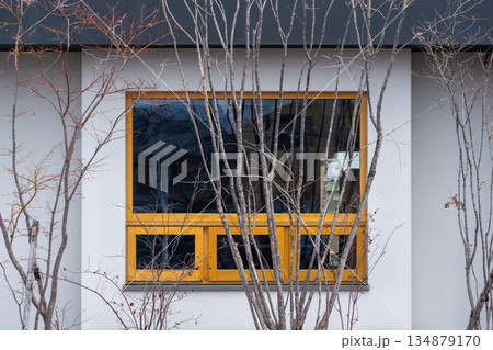 枯れ木の前の窓