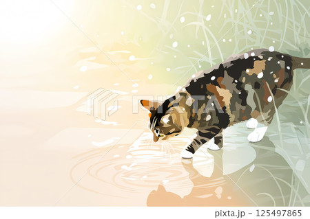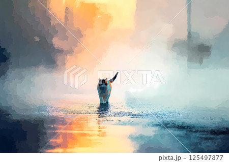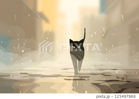 梅雨の和風路地を歩く猫