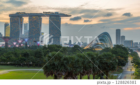 Panorama of Singapore with Gardens by the bay night to day timelapse before sunrise