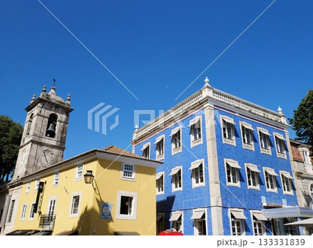 ポルトガル、シントラ 旧市街中心部にある時計塔と青いタイルの家
