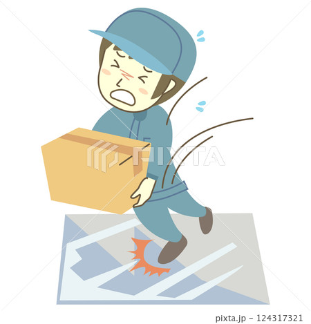 油汚れやつるつるの床で滑る男性配達員セット