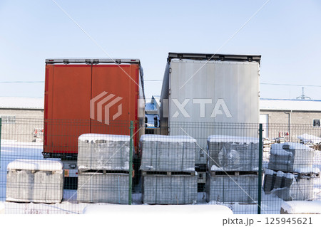 Full view of long trailer truck parked in logistics facility yard covered with snow