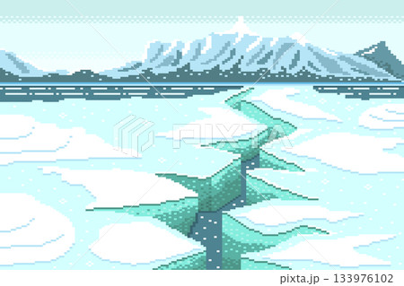 Frost fractures and cracked ice with glacial valleys background, Winter landscape, snow.
