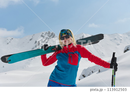 A professional woman skier rejoices after successfully climbing the snowy peaks of the Alps