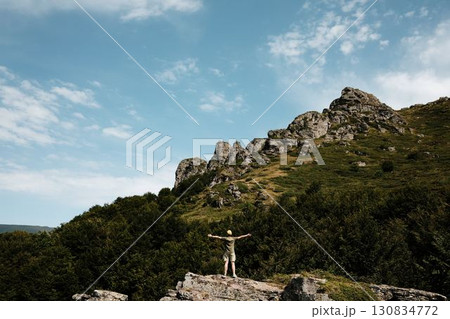 A young woman stands on a cliff in Stara Planina National park, Serbia country, admiring vast green mountains under a blue sky. A perfect moment of freedom and adventure in nature