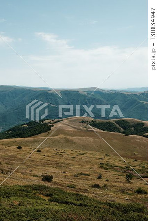 Mountain ridges of Stara Planina stretching across the horizon with forests and dry meadows. Serbia country