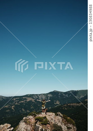 Female hiker with arms wide open standing on a rocky mountain top of Stara Planina with german shepherd dog, nature and freedom concept. Travel and hiking with pet concept