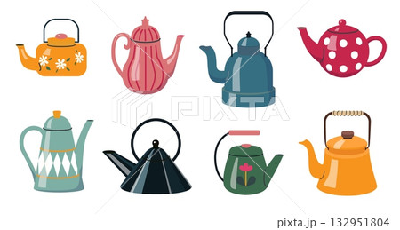 Colorful vintage and modern teapots set in flat cartoon style with floral patterns stripes and polka dots on white background