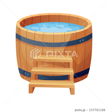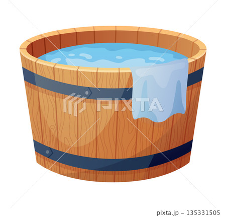 Wooden bath. Wood tub, cartoon rustic water bath barrel for public sauna traditional banya or onsen japanese hot spring, wellness relaxing bathtub basin neat vector illustration of tub bath wooden