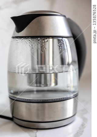 Glass electric kettle. Hot steam details. Modern kitchen