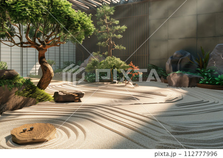 Japanese Zen Garden: Serene Sand and Stone Meditation. Generative Ai.