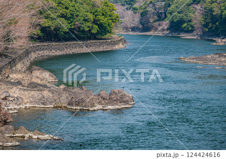 針葉樹林の間を流れる清流 鞍馬川 京都市