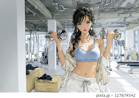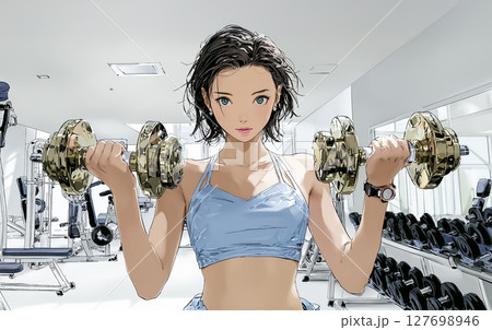 スポーツジムでダンベルを使用して筋力トレーニングをする若い女性のイラスト素材
