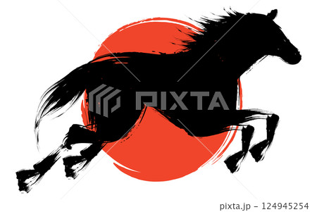 駿馬と初日の出の水墨画風和風素材、2026年の干支、左馬