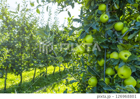 Lush apple orchard filled with vibrant green apples ripening on branches. Sunlight filters through leaves, creating a serene rural scene. Perfect for concepts of agriculture and harvest