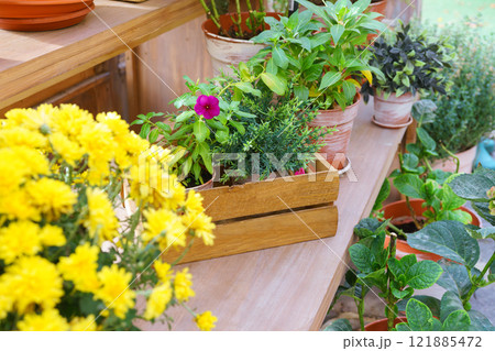 Vibrant indoor plants and flowers in pots on wooden shelves inside of greenhouse