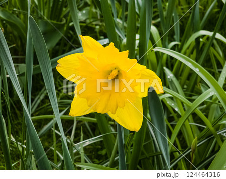 A vibrant yellow flower Narcissus is beautifully surrounded by lush green grass