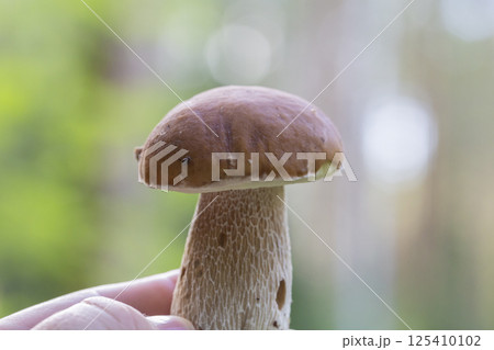Boletus edulis or porcini mushroom in a woman's hand against the background of small fir trees in the summer forest.