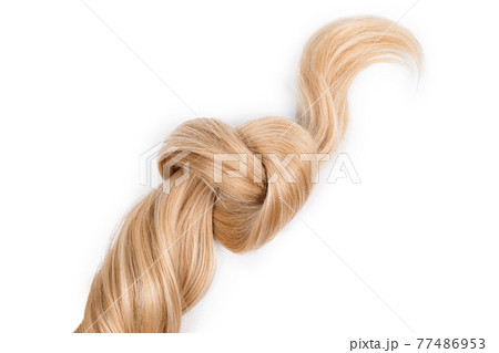 Blonde hair lock tied in knot. Strand of honey blonde hair isolated on white background, top view. Hairdresser service, hair strength, haircut, dying or coloring, hair extension, treatment concept.