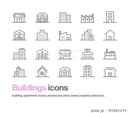 様々な建造物のシンプルなアイコンセット。ビル,病院,倉庫,工場,住宅,学校,店舗,街並み,タワー等