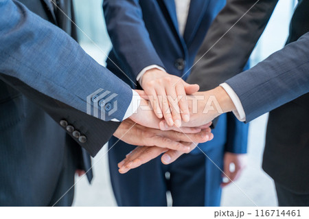 ビジネス 手 重ねる 円陣 真俯瞰