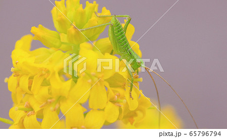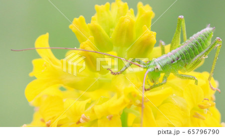 菜の花と子供のヤブキリ