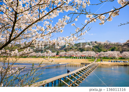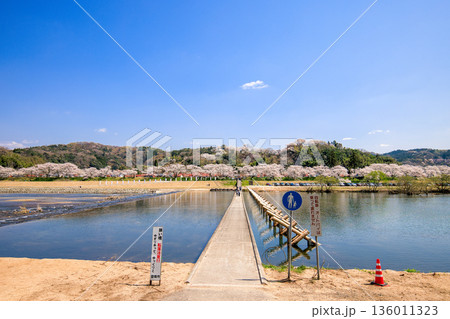 島根県桜名所斐伊川堤防桜並木の沈下橋 願い橋