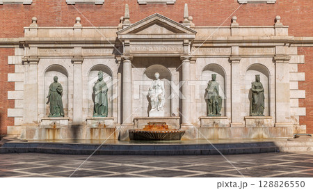 Patriarch's College Square in Valencia timelapse, featuring fountain with sculptures. Spain