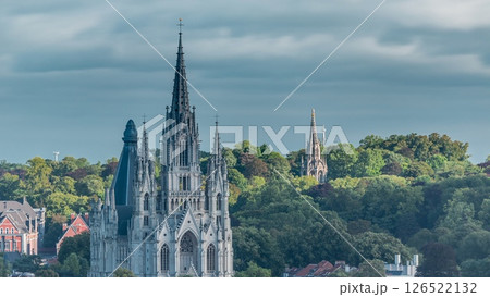 Aerial view of Notre Dame de Laeken church spires timelapse in Brussels, Belgium.