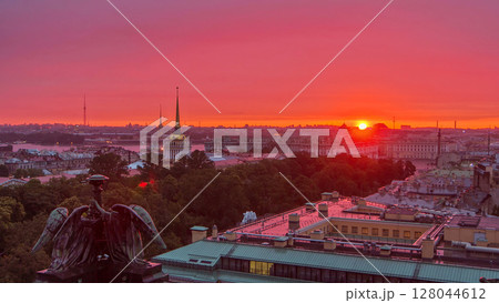 Sunrise over historic center from the colonnade of St. Isaac's Cathedral timelapse.