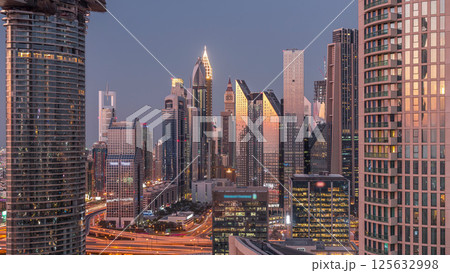 Aerial view of Jumeirah lakes towers skyscrapers day to night timelapse with traffic on sheikh zayed road.