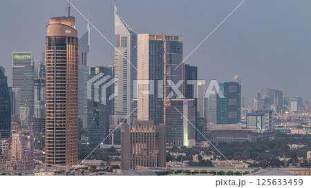 Dubai International Financial Centre district with modern skyscrapers night to day timelapse