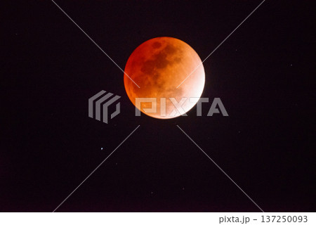 皆既月食で赤く染まるブラッドムーンと星空の天体風景