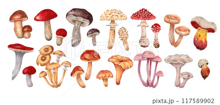 Set of edible and poisonous mushrooms. Watercolor and marker illustration. Botanical small diverse forest plants. Hand drawn isolated clipart. Fantastic autumn nature. For packaging, menu design.