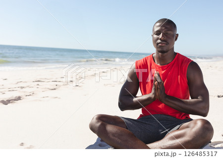 Meditating on beach, African American man in red shirt enjoying peaceful moment, copy space