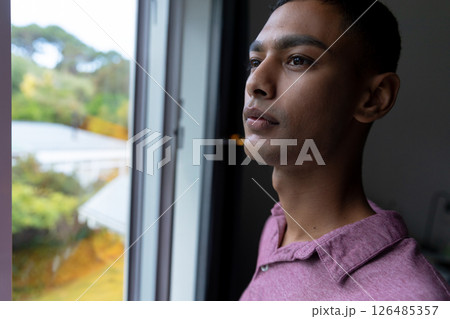 Young man in pink shirt gazing thoughtfully out window at home, copy space