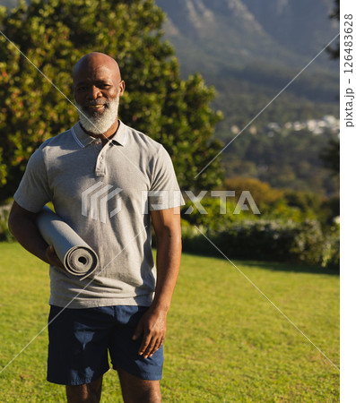 Smiling man holding yoga mat outdoors, enjoying peaceful morning exercise routine