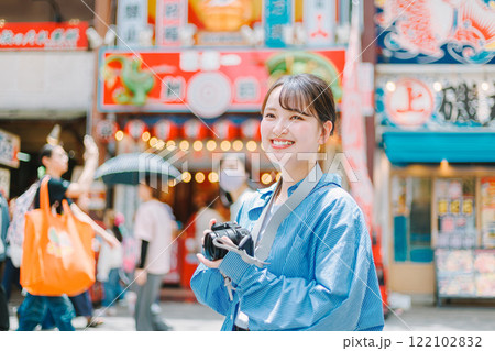大阪の繫華街で趣味の写真撮影を楽しむ若くて可愛大阪の繫華街で趣味の写真い女性イメージ|大阪府内で撮影