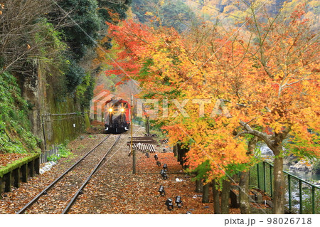 トロッコ保津峡駅を出発した嵯峨野観光鉄道トロッコ列車が嵐山方面へ向けてトンネルに進入していく