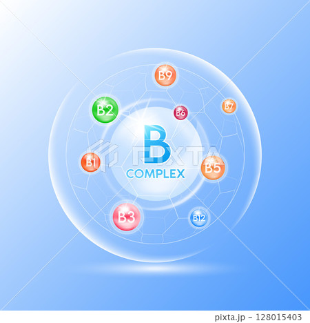 Vitamin B complex minerals. Multivitamins capsules isolated on blue background vector. Dietary supplement for pharmacy advertisement, vitamins package design. Science medic concept.