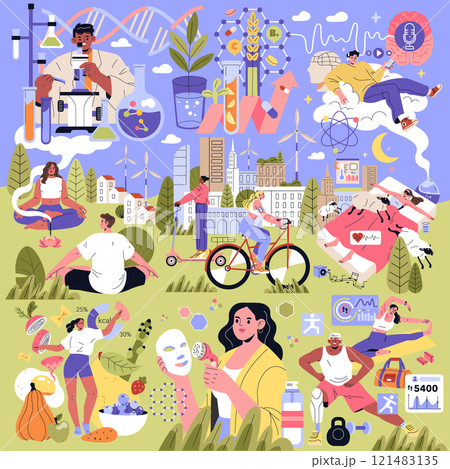 Biohacking concept. A diverse collection of activities embracing genetic experiments, meditation, cycling, and nutrition for wellness. Vector illustration.