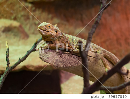 Coastal agama or bearded dragon. The lizard watches zoo visitors from its snake enclosure. Wild animal in captivity, animal cruelty